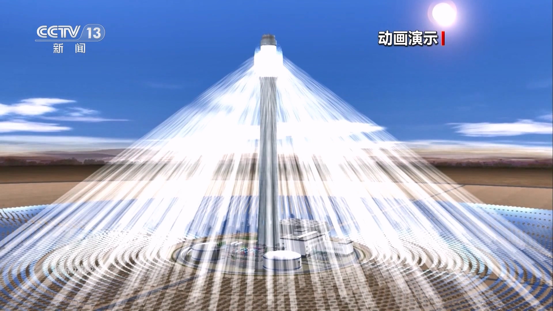 电站通过高精度智能定日镜,实时跟踪太阳的运动,将太阳直接辐射光反射聚集到吸热塔上,将吸热塔内的熔盐加热到560余摄氏度的高温,将高温的熔盐进行储存,在需要发电时再通过高温熔盐与水产生热交换,产生高温高压的蒸汽,驱动汽轮发电机组发电。