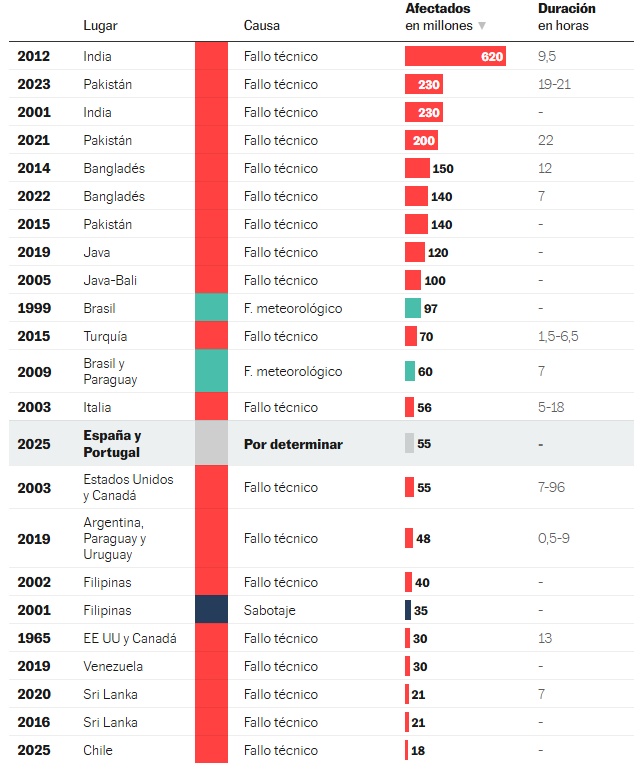 图一:近年全球停电事故及长短(年份,地点,事故原因,受影响的人口,停电时间)。事故原因以技术故障居多(红色),少数为天气(绿色),极少为人为破坏(黑色)停电多在几小时左右。