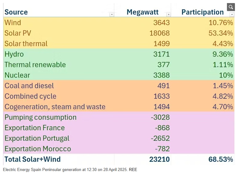 图五:事故过程4月28日发电和用电的演变图。在启动电网的过程中,新能源起到了快速恢复供电的作用。中午12:00后,即便主网崩溃,仍有约30%的新能源保持发电。(图标:橘黄:光伏;浅绿:风能;浅蓝:水利;浅粉:热电联产;黄色:联合循环燃气轮机发电;深紫:核能。)