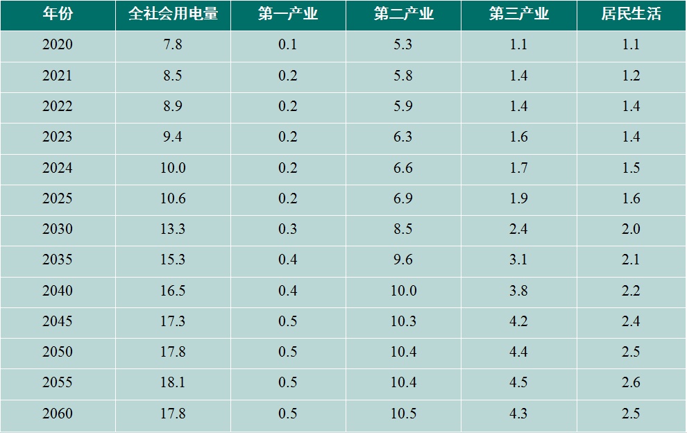 表2 全社会用电量及分产业用电量趋势预测(单位:万亿千瓦时)