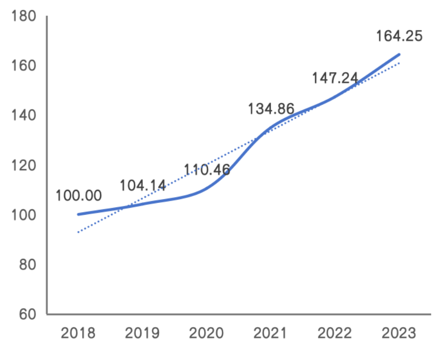 指数结果显示,2023年,内蒙古现代能源经济发展指数高速增长,达164.25点,同比增长11.55%,基期以来年均复合增长10.43%,发展质速较前期进一步提升。从分项指数看,低碳转型、创新驱动、经济高效和社会贡献四大维度发展均稳中向好、好中有进、进中蓄势,在错综复杂的国内外形势挑战下彰显了内蒙古现代能源经济的活力与潜力。