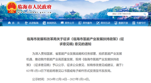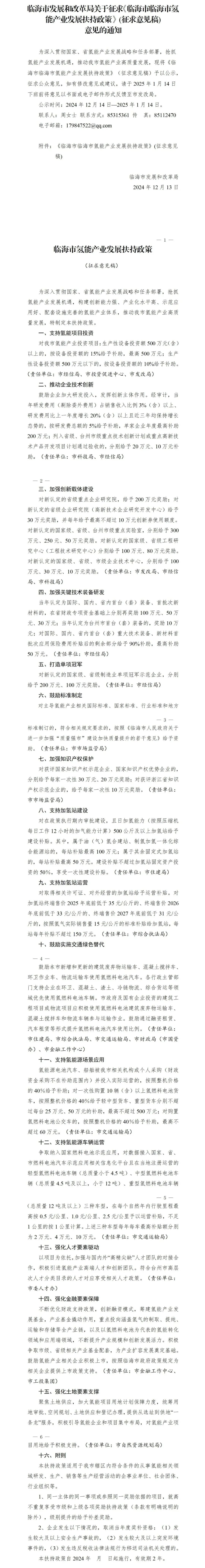 12月13日,浙江临海市发布《临海市氢能产业发展扶持政策》(征求意见稿) 。该扶持政策的征求意见稿指出,支持氢能项目投资。对临海市氢能产业投资项目:生产性设备投资额500万元(含)以上的,按设备投资额的15%给予补助,最高500万元;生产性设备投资额500万元以下的,按设备投资额的10%给予补助。