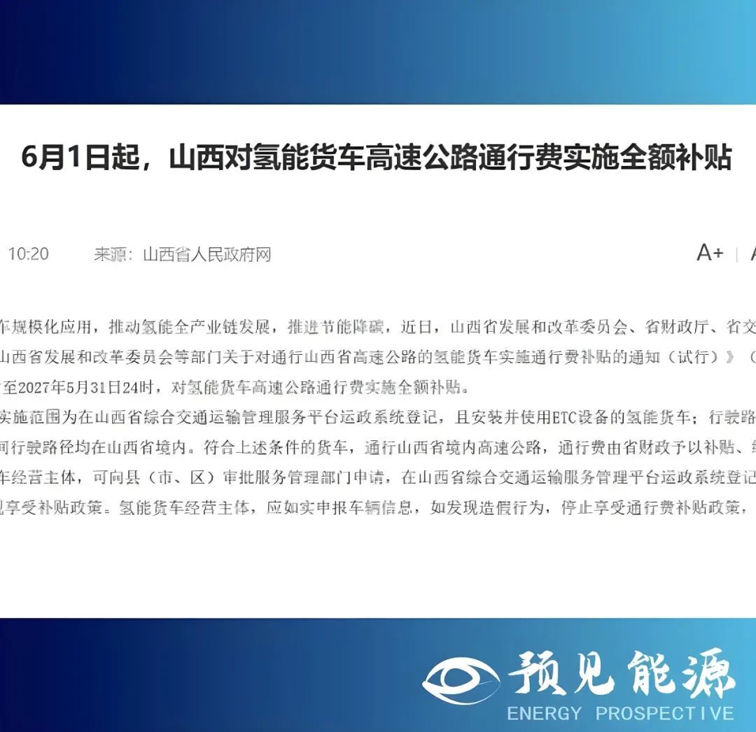 5月21日,山西省发改委等四部门联合下发通知,自2025年6月1日至2027年5月31日,对符合条件的氢能货车在山西省高速公路通行费实施全额补贴。