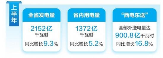 发电量、用电量、送电量持续增长,有力支撑全省经济发展。上半年,全省发电量、省内用电量分别为2152亿千瓦时、1372亿千瓦时,同比分别增长9.3%、5.2%;“西电东送”较计划增长,全部外送电量达900.8亿千瓦时,同比增长16.8%。截至6月底,全省电力装机突破1.66亿千瓦,其中,绿色电力装机超过1.5亿千瓦,居全国首位,绿色装机占比突破90%,绿色底色更加鲜明。