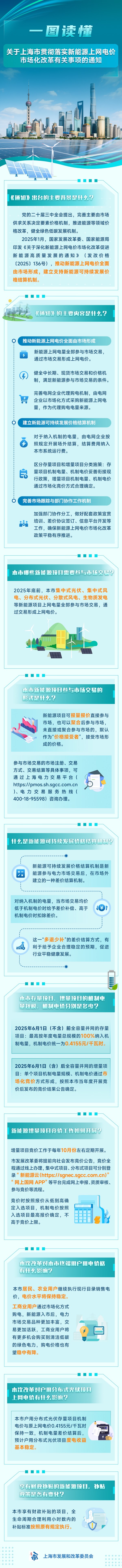 上海市发展改革委介绍,为推动新能源公平参与电力市场交易,促进新能源高质量可持续发展,《关于上海市贯彻落实新能源上网电价市场化改革有关事项的通知》近日发布。通知主要包括推动新能源上网电价全面由市场形成、建立新能源可持续发展价格结算机制、完善市场跟踪与部门协作工作机制等三个方面共17条措施,将试行至2026年底。