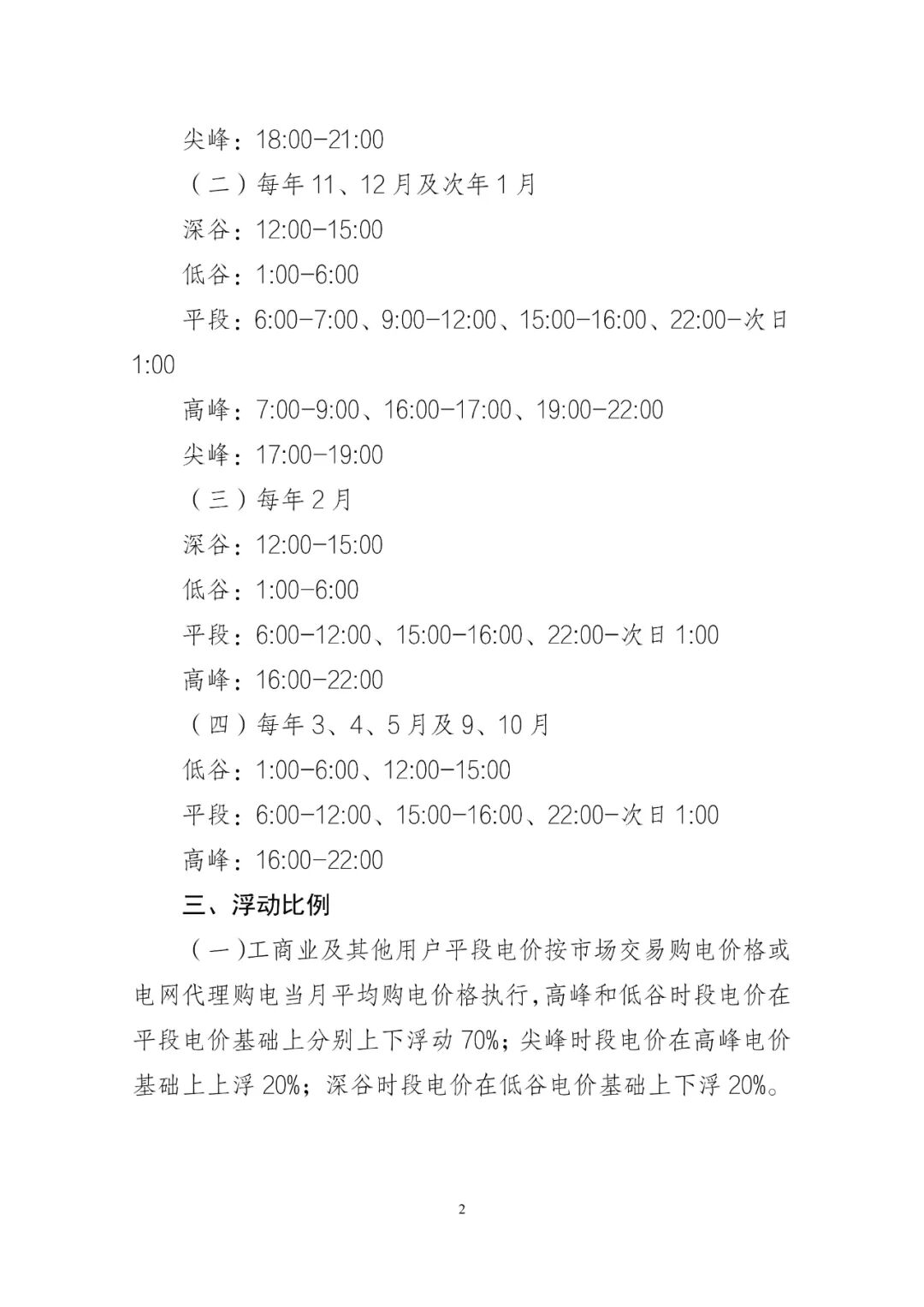 关于浮动比例,工商业及其他用户平段电价按市场交易购电价格或电网代理购电当月平均购电价格执行,高峰和低谷时段电价在平段电价基础上分别上下浮动70%;尖峰时段电价在高峰电价基础上上浮20%;深谷时段电价在低谷电价基础上下浮20%。