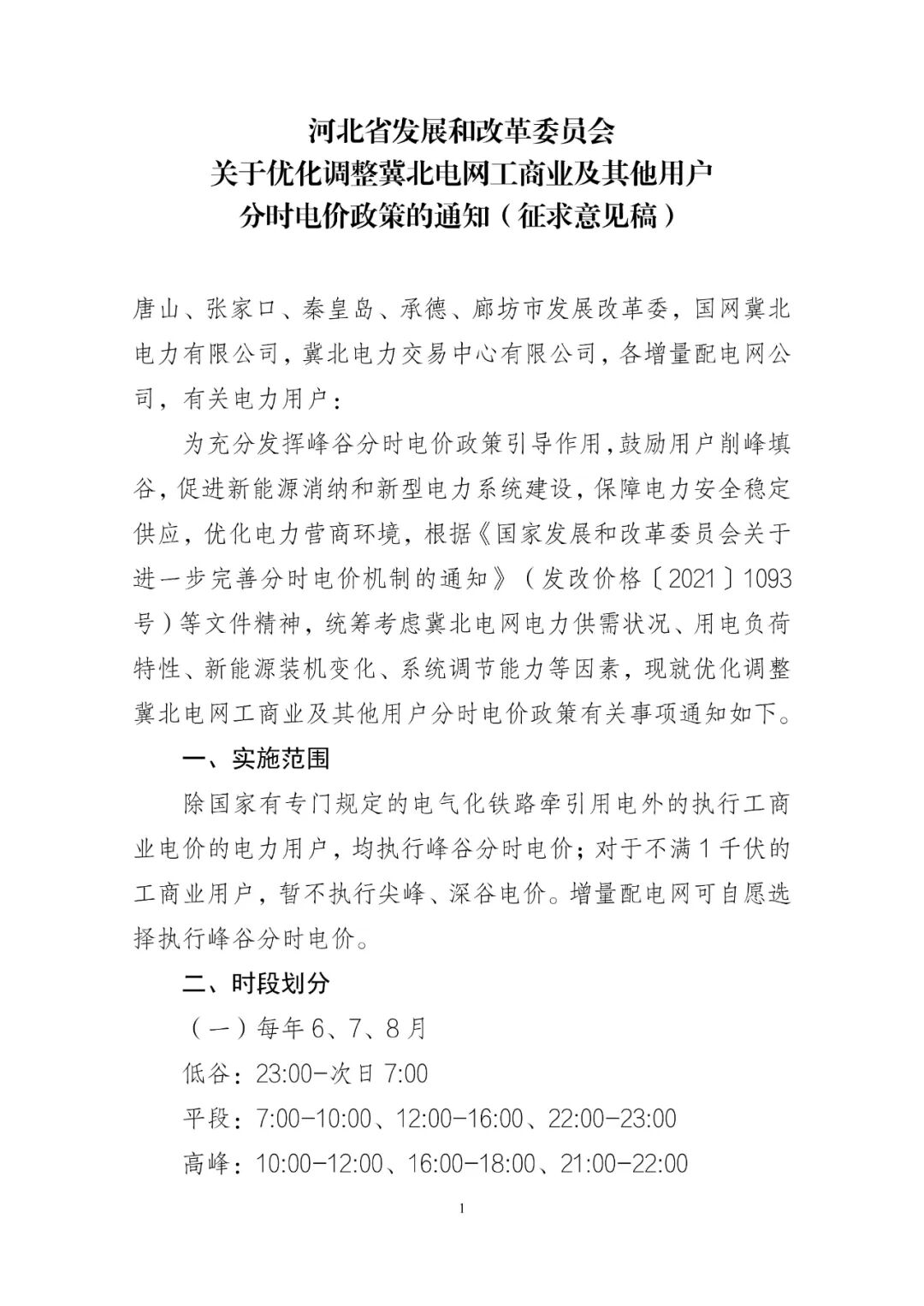 10月16日,河北省发展和改革委员会发布关于公开征求《关于优化调整冀北电网工商业及其他用户分时电价政策的通知(征求意见稿)》意见的公告。