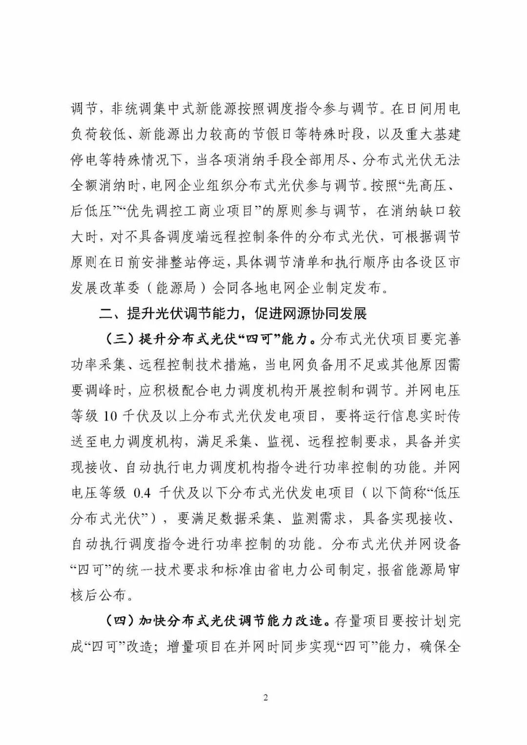 在日间用电负荷较低、新能源出力较高的节假日等特殊时段,以及重大基建停电等特殊情况下,当各项消纳手段全部用尽、分布式光伏无法全额消纳时,电网企业组织分布式光伏参与调节。按照“先高压、后低压”“优先调控工商业项目”的原则参与调节,在消纳缺口较大时,对不具备调度端远程控制条件的分布式光伏,可根据调节原则在日前安排整站停运,具体调节清单和执行顺序由各设区市发展改革委(能源局)会同各地电网企业制定发布。