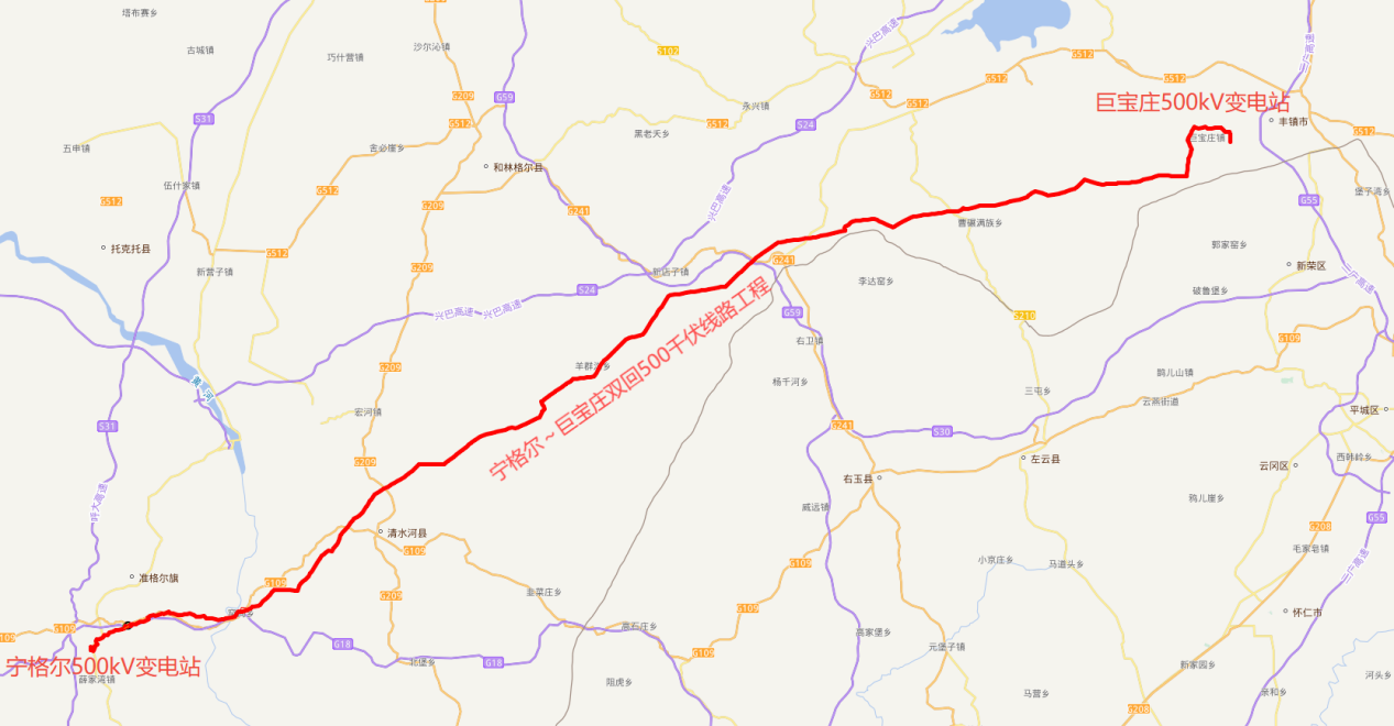 宁格尔—巨宝庄双回500千伏线路工程途经呼和浩特市、乌兰察布市、鄂尔多斯市。项目内容包括扩建两个500千伏间隔、同时新建500千伏同塔双回线路约198公里乌海海南建设相应通信和二次系统工程。项目建成后,可加强蒙西电网输送高比例新能源的绿色电力通道,满足东部地区日益增长的负荷需要。