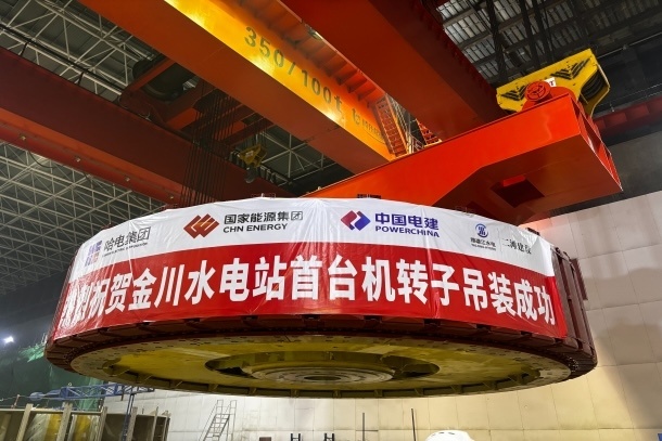 图为大渡河金川水电站4号机组转子吊装现场