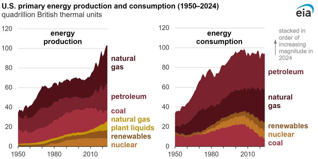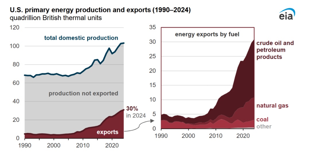 2024年,美国在能源生产和出口方面均创下多项纪录,继续保持能源产量大于消费量的态势。美国一次能源总产量达到创纪录的103千万亿英热单位(quads),其中同样创纪录的是出口30.9 quads至其他国家,比2023年增长4%。与此同时,能源进口量维持在21.7 quads不变,这意味着美国的能源净出口量达到9.3 quads,为自1949年有记录以来的最高水平。