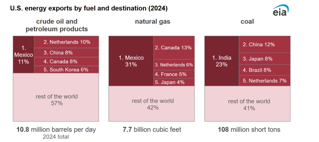 2024年,墨西哥是美国原油和石油产品以及天然气的最大出口目的地,印度则是美国煤炭的最大出口目的地。荷兰凭借其位于鹿特丹的大型储运设施和区域贸易枢纽地位于2024年跻身美国石油、天然气和煤炭的前五大出口目的地之列。 (林子涵)