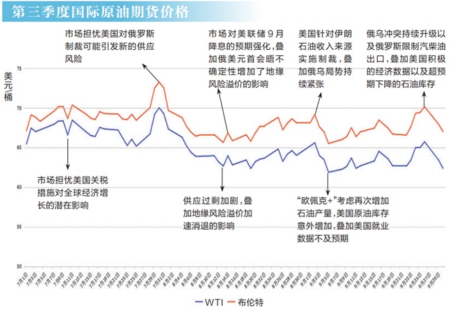 10月10日,受到美国威胁大幅提高关税、“欧佩克+”持续增产以及中东地区地缘政治风险溢价消退等因素的影响,WTI原油期货价格较前一个交易日下跌4.2%,达58.9美元/桶,布伦特原油期货价格较前一个交易日下跌3.8%,达62.73美元/桶。进入10月以来,国际油价接连下挫。而刚刚过去的第三季度,国际油价运行中枢上移。布伦特原油期货价格均价为68.17美元/桶,比第二季度均价上涨1.46美元/桶。