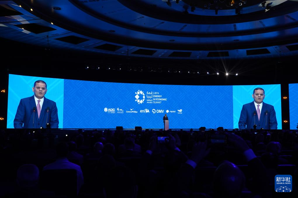 1月24日,在利比亚首都的黎波里,利比亚民族统一政府总理德拜巴在第四届利比亚能源与经济峰会上致辞。新华社发(哈泽姆·图尔基亚摄)