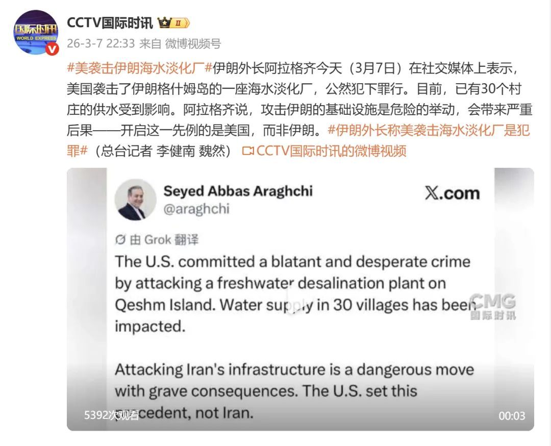 伊朗外长阿拉格齐3月7日在社交媒体上表示,美国袭击了伊朗格什姆岛的一座海水淡化厂,公然犯下罪行。目前,已有30个村庄的供水受到影响。阿拉格齐说,攻击伊朗的基础设施是危险的举动,会带来严重后果——开启这一先例的是美国,而非伊朗。