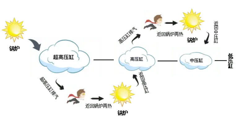 一次再热技术,是在过热器后设置再热器,将汽轮机高压缸做功后的过热蒸汽返回再热器进行再次加热,进入汽轮机中压缸继续做功发电。通过一个小改进,对功率进行了大提升。