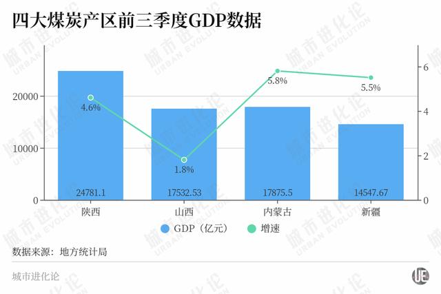今年前三季度,山西、内蒙古、陕西和新疆GDP分别为1.75万亿元、1.79万亿元、2.48万亿元和1.45万亿元,同比分别增长1.8%、5.8%、4.6%、5.8%。