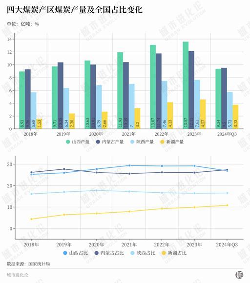 国家统计局数据显示,2024年前三季度山西、内蒙古、陕西和新疆原煤产量分别为9.34亿吨、9.5亿吨、5.73亿吨和3.73亿吨,贡献全国产量的81.42%。在过去五年多时间里,四大煤炭产区占全国的比重上升4.59%,其中新疆上升4.38%。