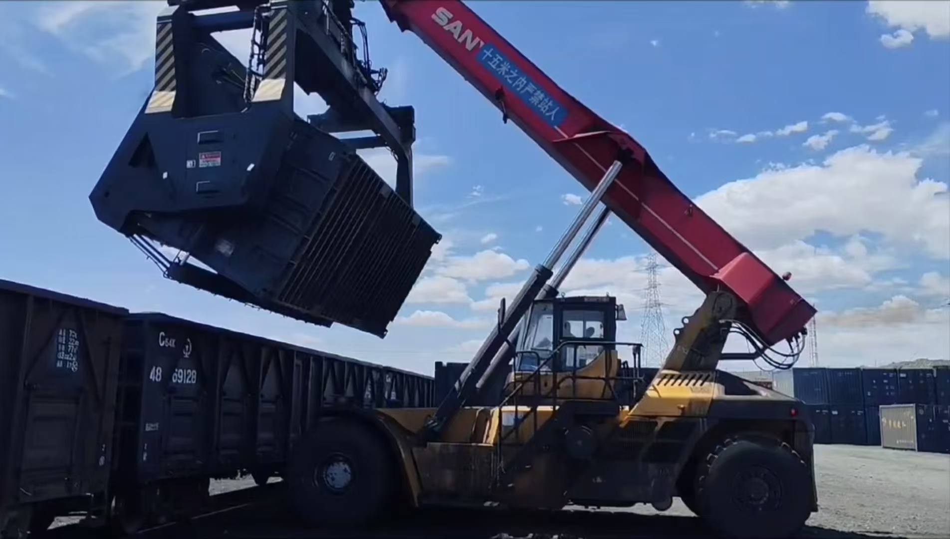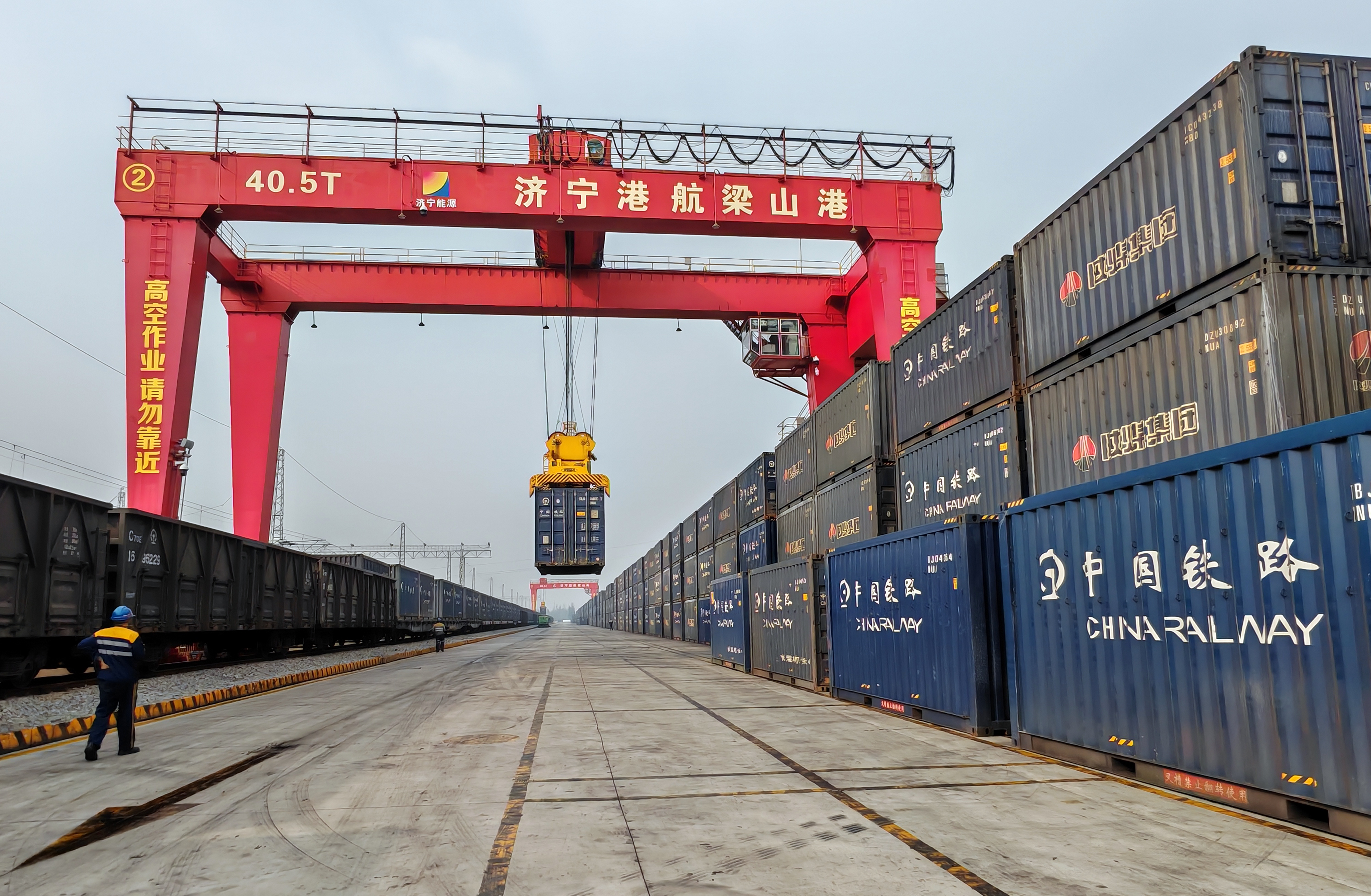 山东梁山港铁路专用线集装箱卸车作业现场