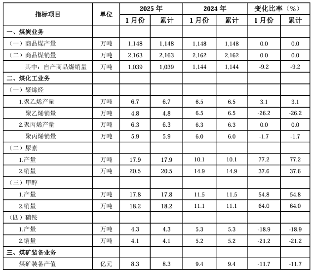 中煤能源2月13日发布的公告显示,2025年1月份,中煤能源商品煤产量为1148万吨,同比持平;环比减少38万吨,下降3.2%。