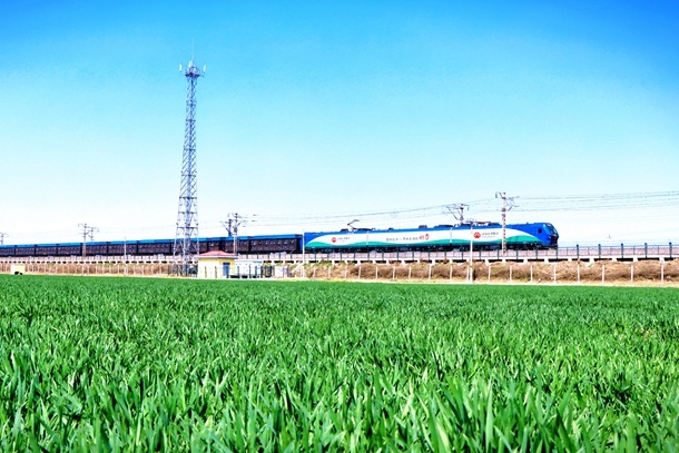 图为朔黄铁路集装箱列车行驶在华北平原上