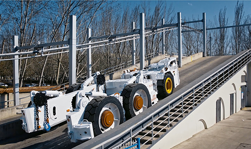 该套装备由框架式支架搬运车和铲板式支架搬运车组成。框架式支架搬运车搭载高功率清洁防爆发动机,动力强劲;6*6全轮驱动,牵引力大;具备反拖制动功能,重载下坡安全性高。铲板式搬运车搭载蓄电池动力源,井下作业零排放;采用分布式轮边驱动系统,电液复合协调制动,具有优越的驾驶操控性能。同时,该套装备搭载了全景环视、人员防接近、自动驻车等主动安防智能辅助驾驶系统,提升了大型装备在受限空间作业的安全性能。
