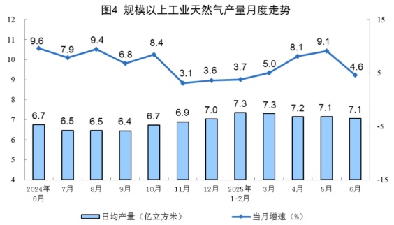 天然气生产稳定增长。6月份,规上工业天然气产量212亿立方米,同比增长4.6%,增速比5月份放缓4.5个百分点;日均产量7.1亿立方米。