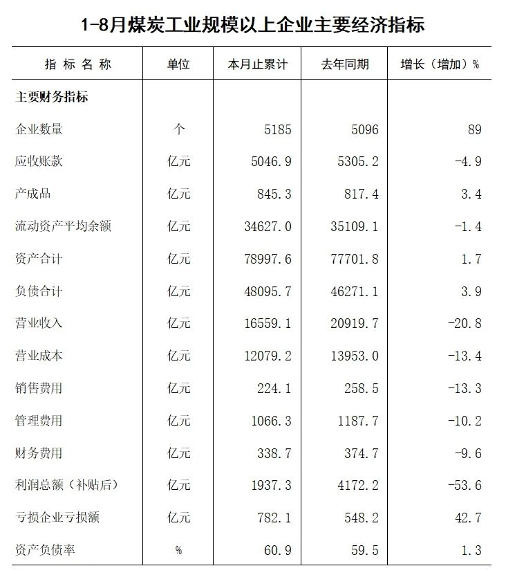 1月—8月煤炭工业规模以上企业主要经济指标