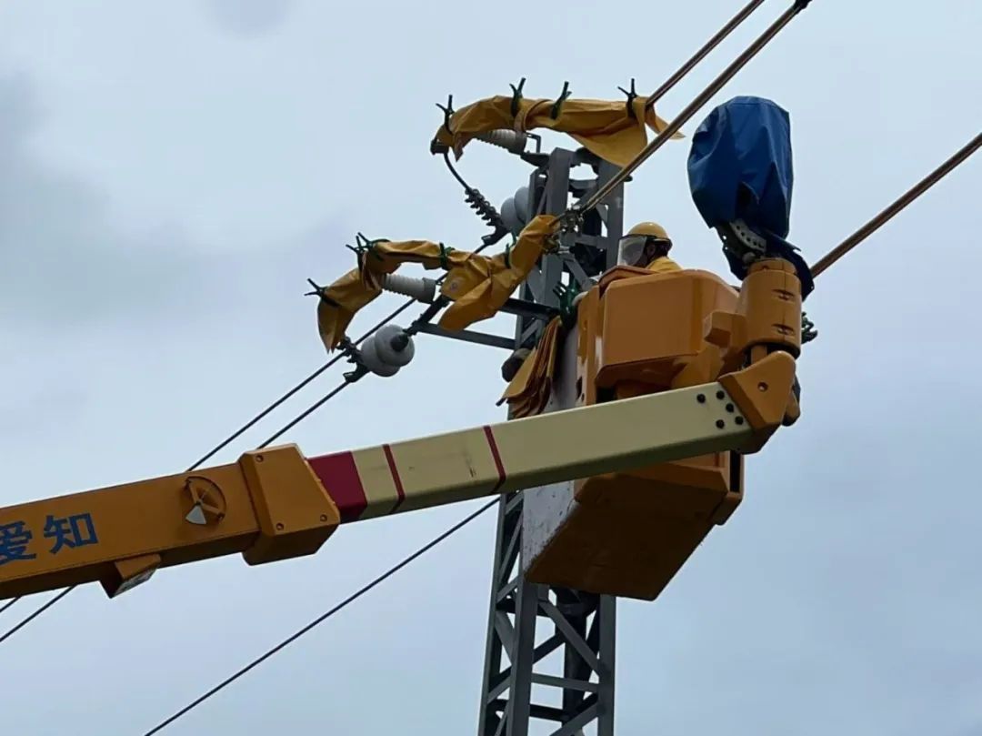 南方电网广东汕尾海丰供电局大湖供电所赶在台风来临前做好提前防御工作,更换线路绝缘子等设备。(杨潭锡 摄)