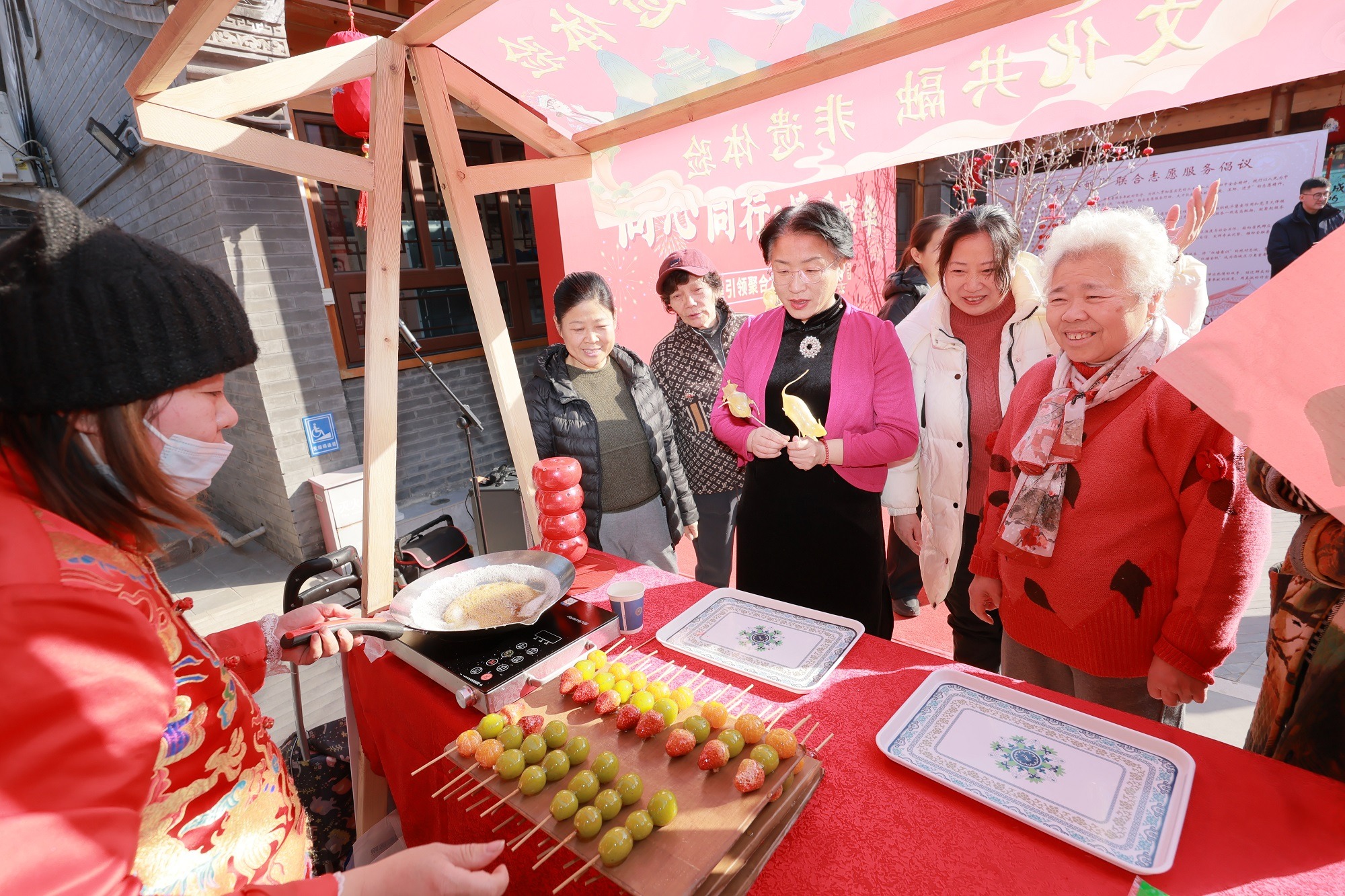 2月12日,北京西城区东松树党群服务中心,在华电财务公司党委联合北京西长安街街道工委举办的“同心同行·情暖京华”迎新春联合志愿服务活动上,吹糖人、捏面人等非遗技艺档口前人气高涨,广大居民踊跃参与。