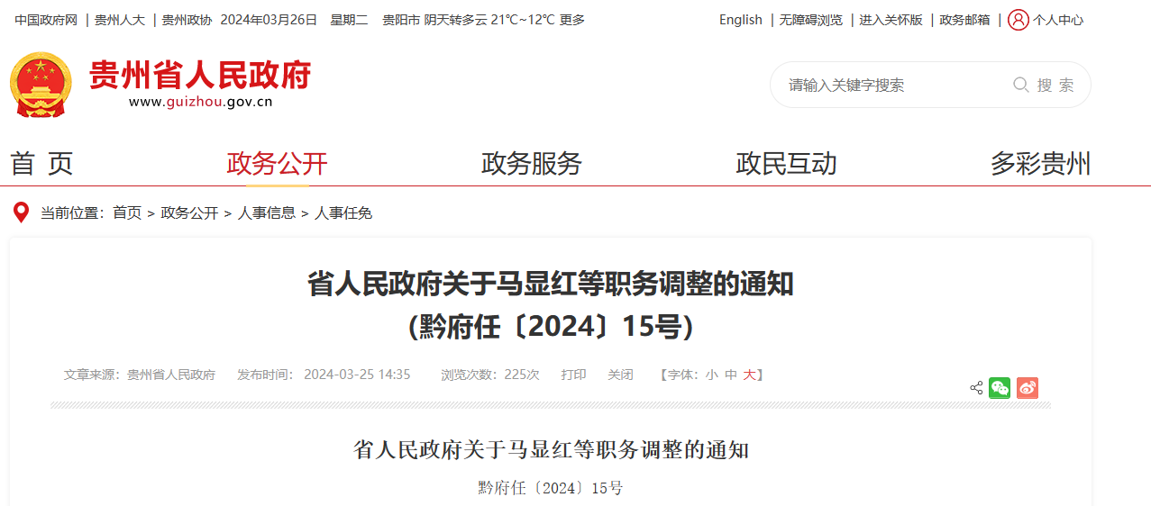 3月25日,贵州省人民政府发布关于马显红等职务调整的通知。