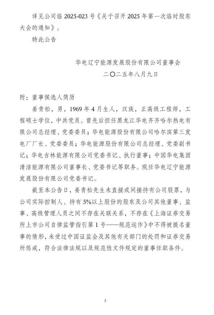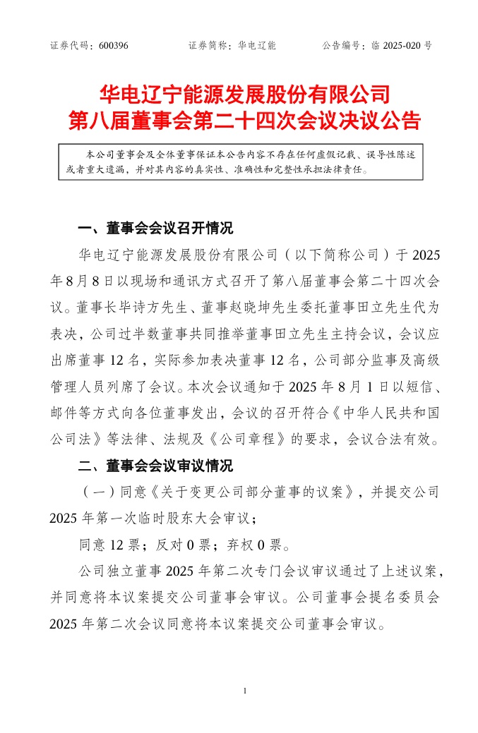 华电辽宁能源发展股份有限公司发布公告称,公司于8月8日召开第八届董事会第二十四次会议,同意《关于变更公司部分董事的议案》。经公司控股股东中国华电集团有限公司建议,并经公司董事会提名委员会审查通过,公司董事会同意毕诗方先生辞去董事、董事长职务,并补选姜青松先生为公司第八届董事会董事候选人。