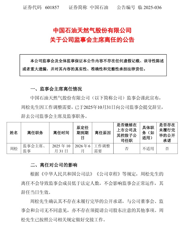 中国石油发布公告称,公司监事会宣布,周松先生因工作调整需要,已于2025年10月31日向公司监事会提交辞呈,辞去公司监事会主席及监事职务。