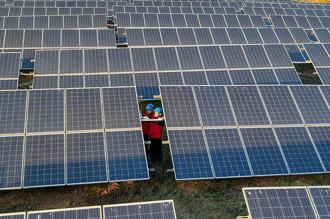 电力员工协助村级分布式光伏义务检修,确保设备安全稳定运行。臧广聚摄