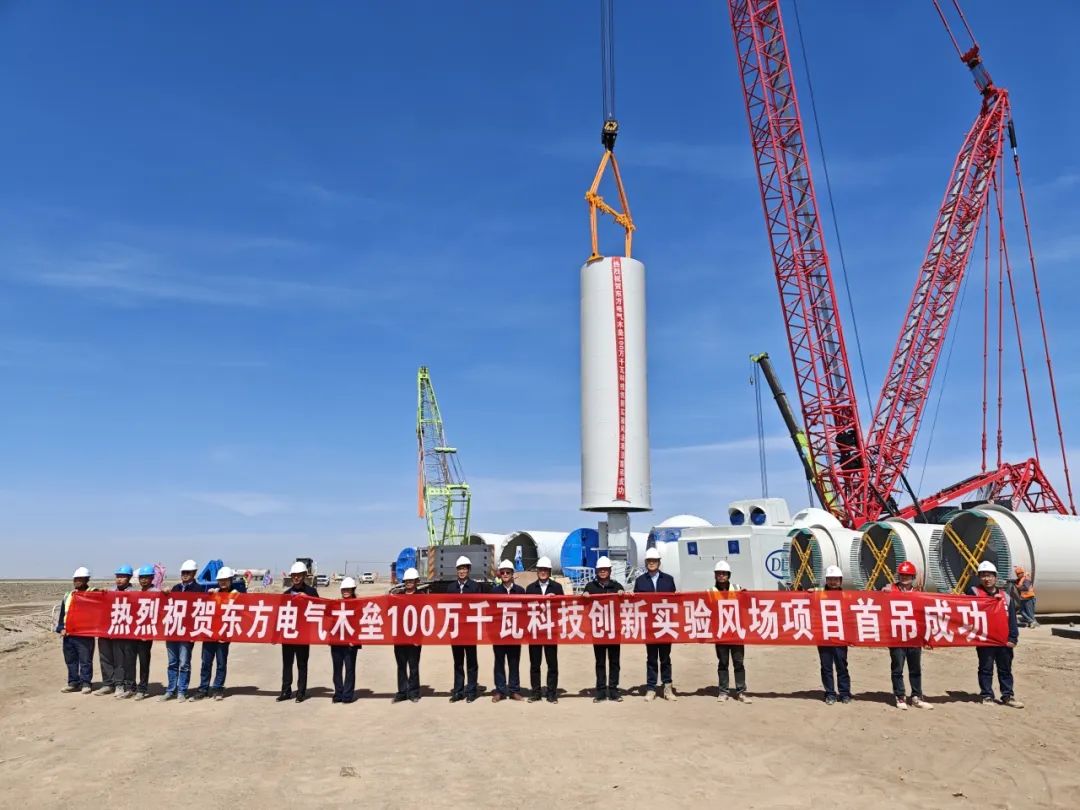 近日,在新疆木垒广袤的戈壁滩上,由东方电气集团所属东方风电承建的东方电气木垒100万千瓦科技创新实验风场顺利完成首台风机吊装,以“硬核速度”交出又一答卷。