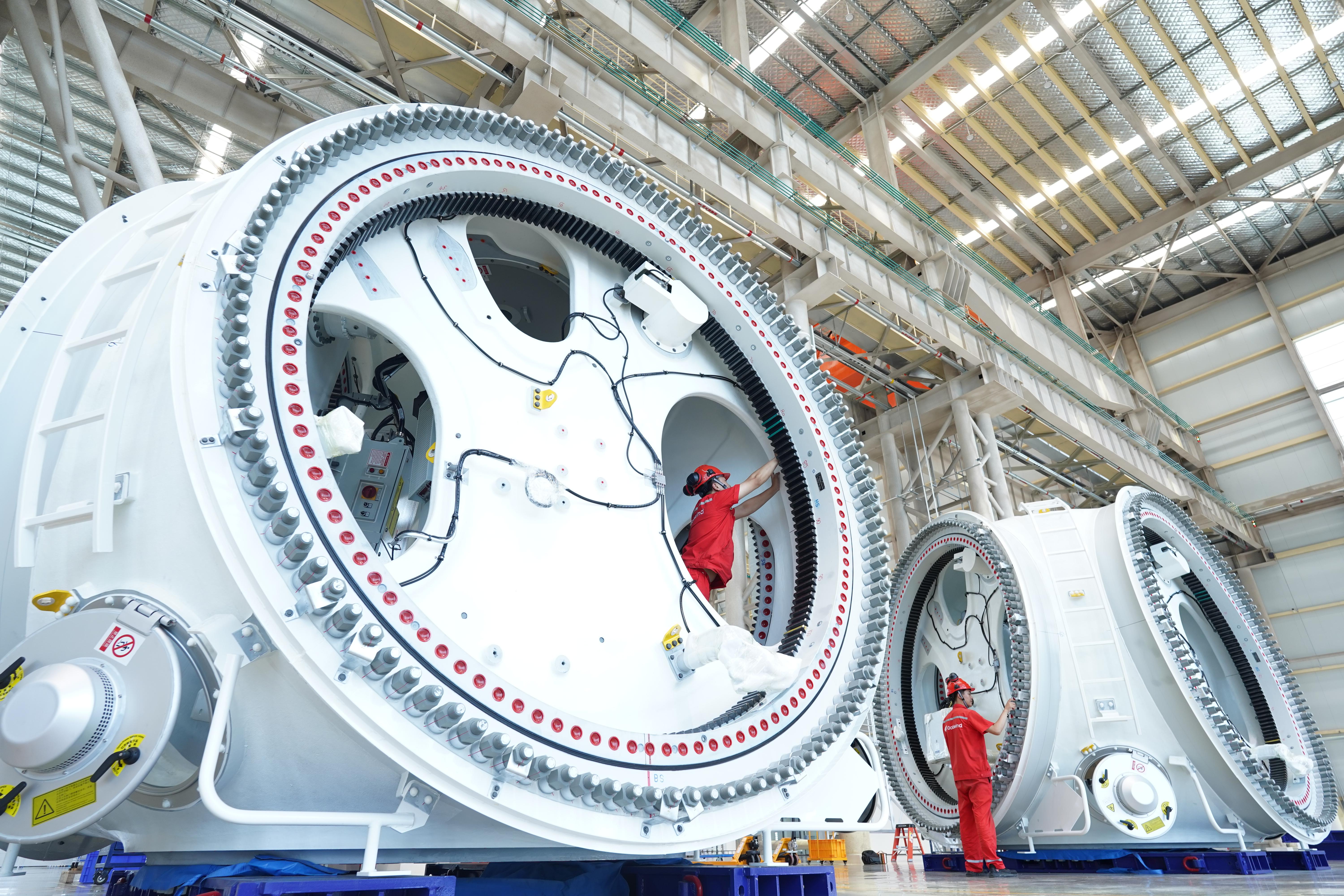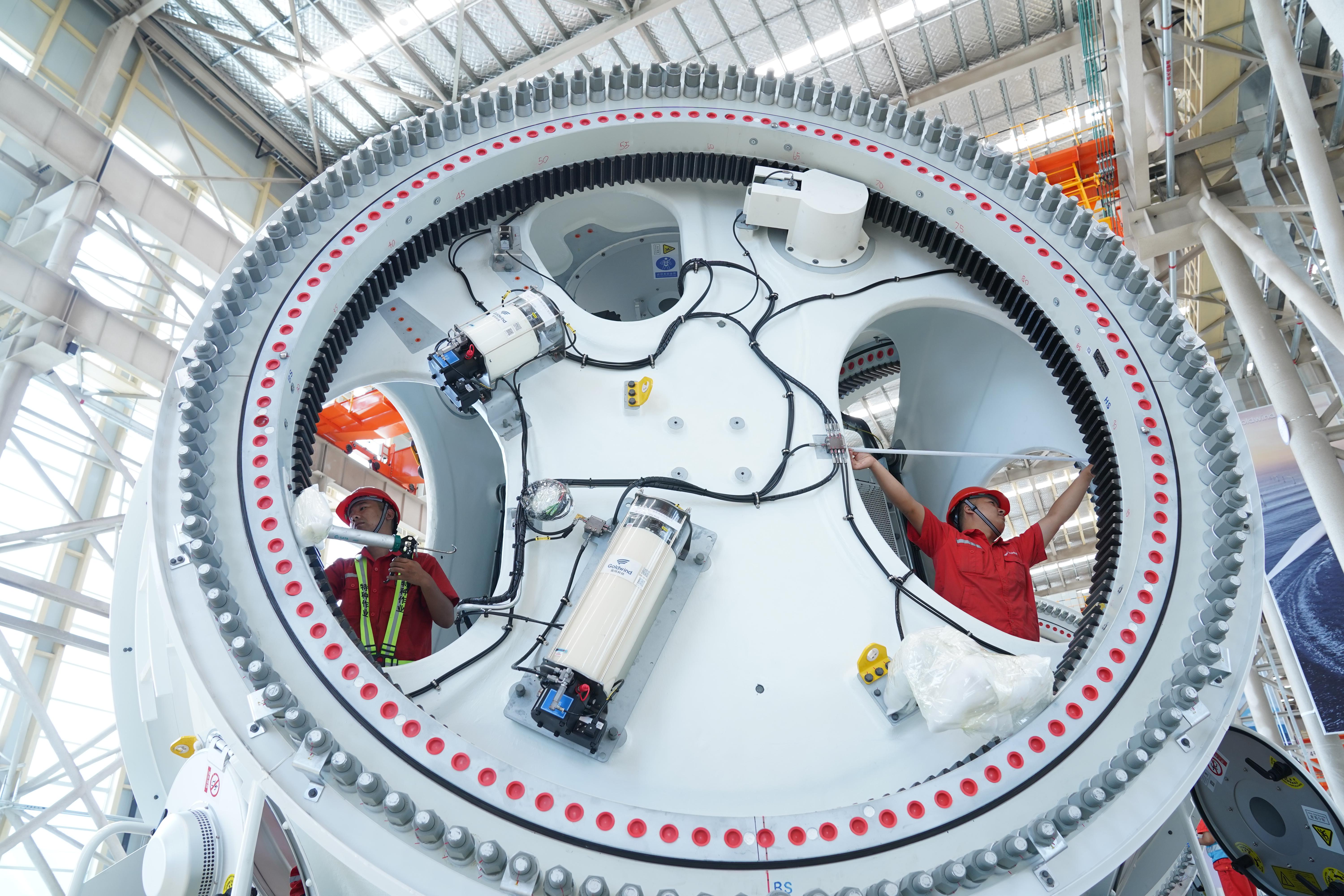 工人正在检测金风科技秦皇岛总装基地下线的机舱叶轮。王继军 摄