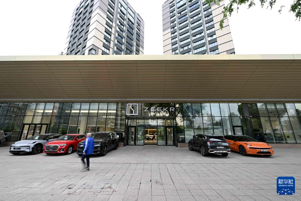 5月26日,在哈萨克斯坦阿拉木图市区,一名男子从一家中国品牌新能源汽车门店前走过。新华社记者李任滋摄