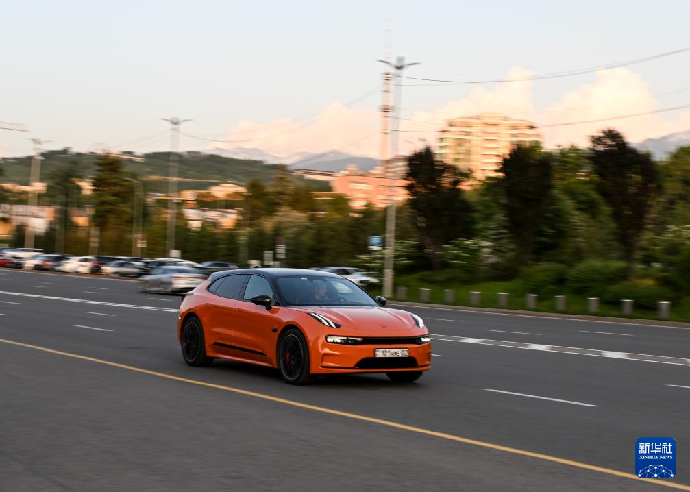5月15日,一辆中国品牌新能源汽车行驶在哈萨克斯坦阿拉木图市区。新华社记者李任滋摄