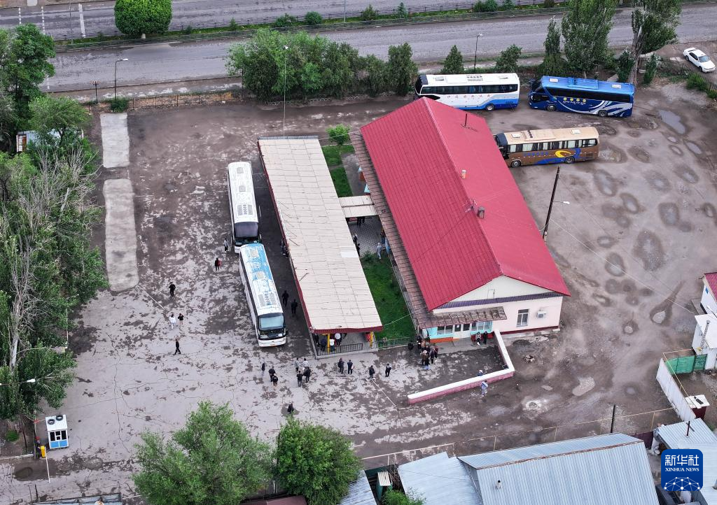 5月24日清晨,“摆渡人”在哈萨克斯坦扎尔肯特镇汽车站准备登上返回霍尔果斯的大巴。新华社记者李任滋摄