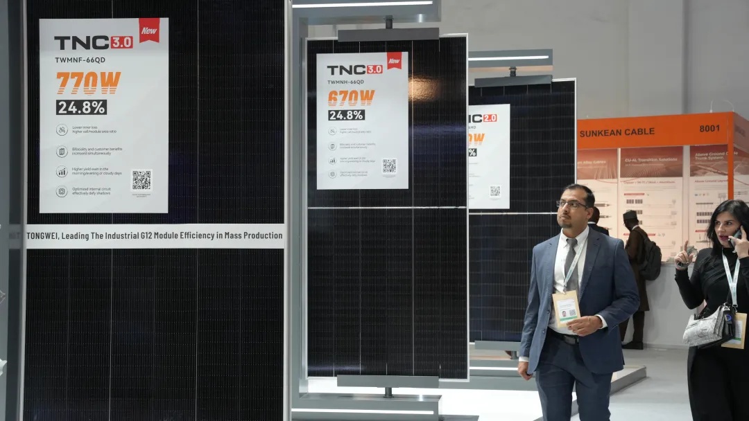 在TOPCon方面,通威TNC 3.0 G12R-66版型最高功率可达670W,转化效率24.8%;TNC 3.0 G12-66版型最高功率可达770W,转化效率24.8%,是行业里210组件效率的领跑者。集极致功率、高温抗性、遮挡优化、高双面率等多维优势于一身,为全球电站业主构建起一道坚不可摧的价值护城河。