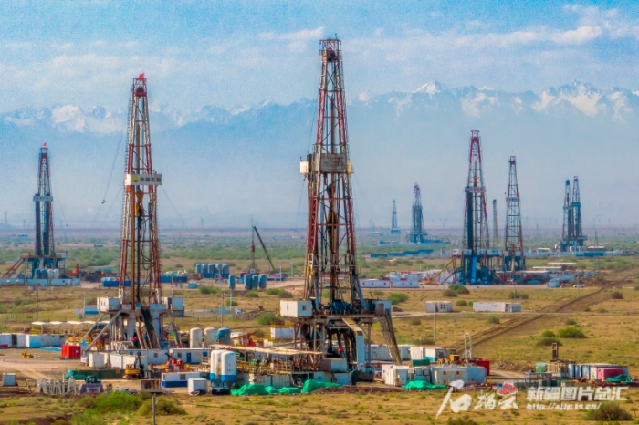 2023年6月8日,在新疆油田公司吉庆油田作业区,钻井耸立在天山脚下。闵勇摄
