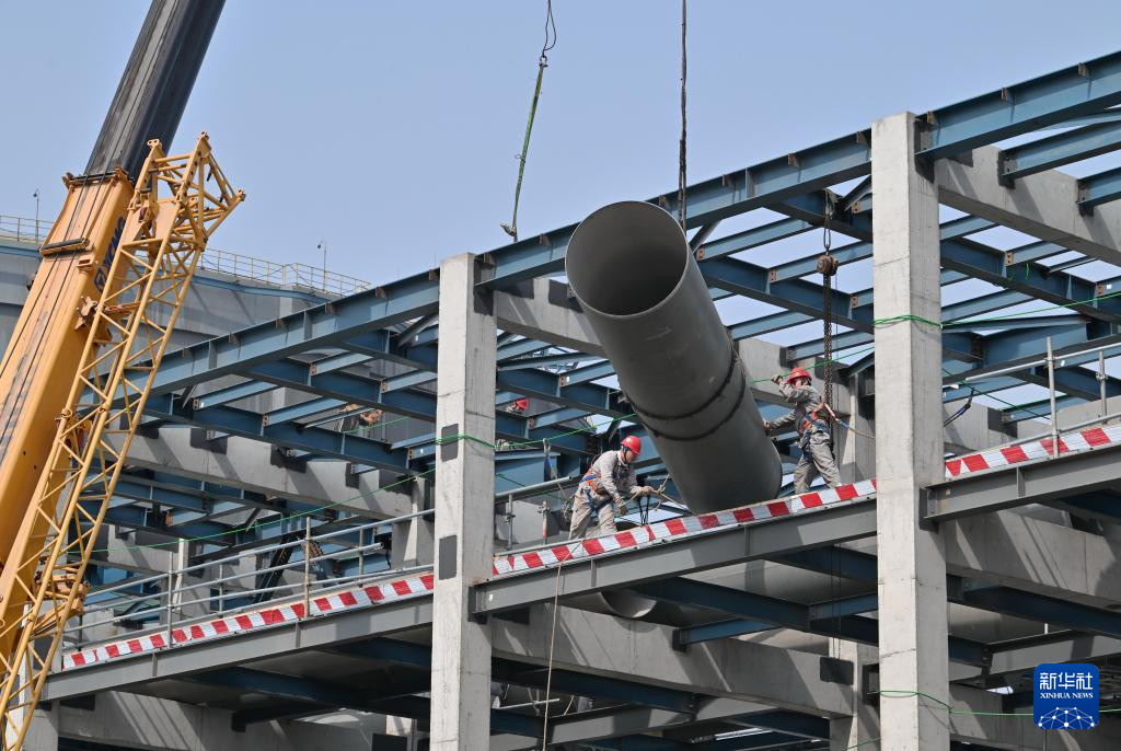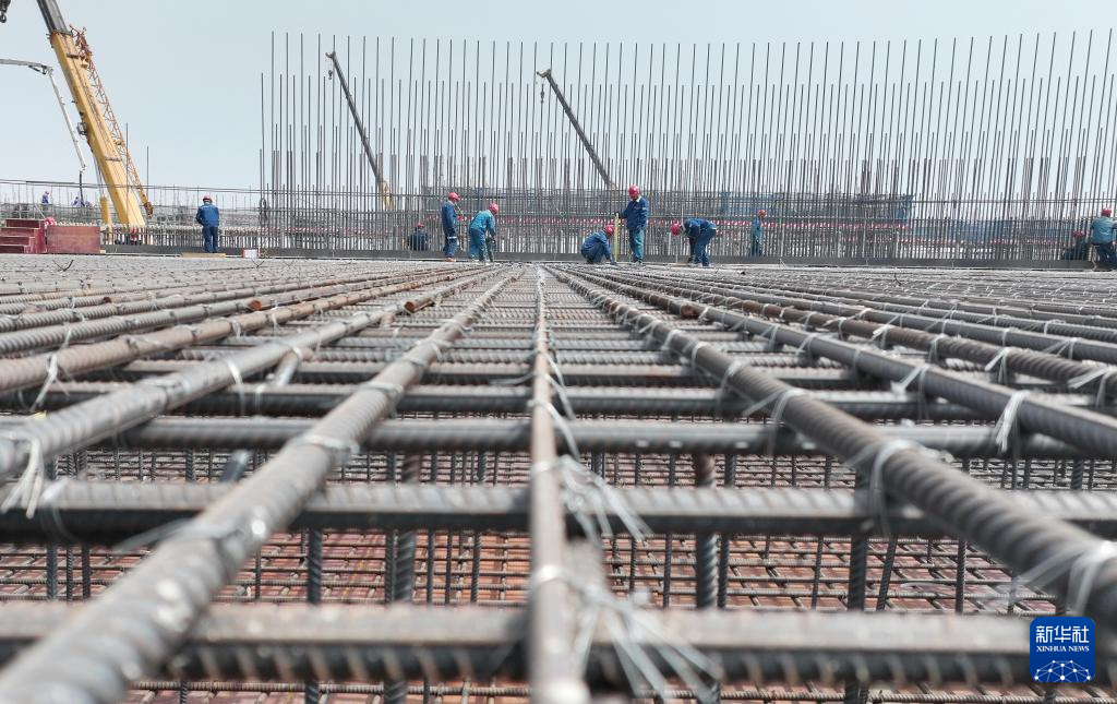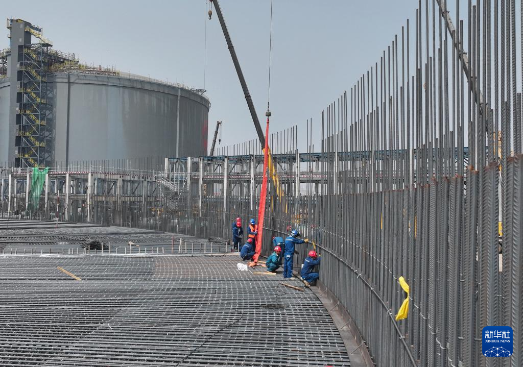 4月17日,工人在唐山市曹妃甸新天LNG接收站项目建设工地施工。