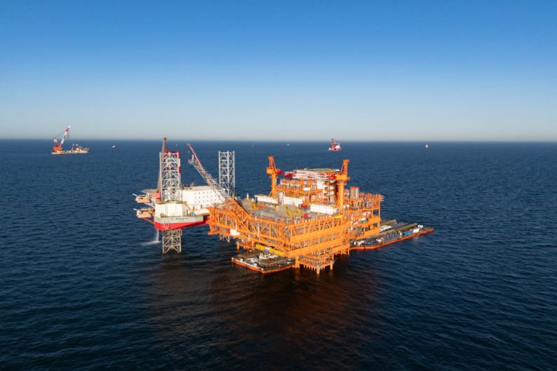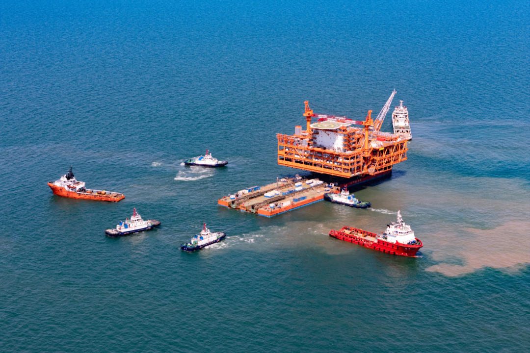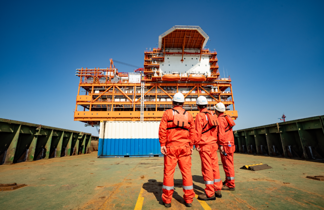 本次安装的中心处理平台是一座集生产、生活设施为一体的3层8腿多功能海洋平台,高度22.8米,投影面积相当于15个标准篮球场大小,设计重量超2万吨,是渤海海域迄今为止重量最重、外形尺寸最大的海上油气平台。平台重量超过国内海上浮吊能力极限,项目团队采用浮托技术对其进行海上安装。