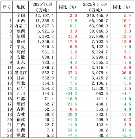 表1 2025年1—6月全国分省区原煤产量