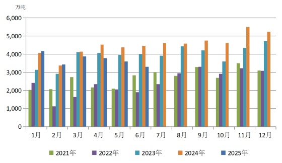 图3 2021—2025年煤炭月度进口量