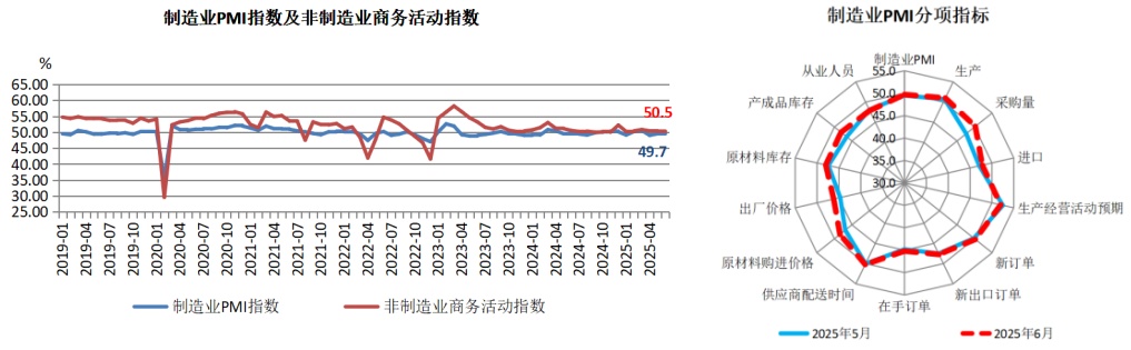 6月份,制造业采购经理指数(PMI)、非制造业商务活动指数和综合PMI产出指数分别为49.7%、50.5%和50.7%,比上月上升0.2、0.2和0.3个百分点,三大指数均有所回升,我国经济景气水平总体保持扩张。不过,制造业PMI仍在荣枯线以下,且三月移动平均值49.4%低于去年同期,经济底部回升态势仍存在较大不确定性。从分项指数看,关税的缓和对制造业预期有所支撑,制造业供需皆有所上行。6月制造业生产指数、新订单指数、新出口订单指数分别为51%、50.2%、47.7%,较上月分别上升0.3个百分点、0.4个百分点、0.2个百分点。特别是在扩大内需政策支撑下,内生动能修复明显,新订单指数进入扩张区间,供需缺口有所收缩。同时PMI出厂价格指数和原材料购进价格指数分别上涨1.5个百分点至46.2%和48.4%,不过仍在收缩区间。且就业指数的下滑以及小企业的收缩也展现了目前微观主体信心不足,1—6月工业企业利润的继续下滑亦表明企业运营存在压力。