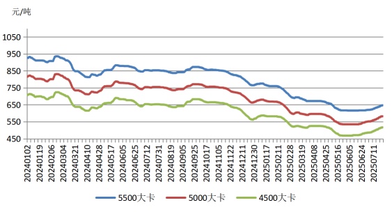 尽管高温天气推升用电需求,贸易商报价保持坚挺甚至部分小幅探涨,但货源整体充足、电厂存煤可用天数处于高位,仅维持少量刚需采购。市场交易氛围有所回暖,但很多用户对当前高价现货持抵触情绪,拉运意愿偏低,阶段性采购规模不足。不过供应端受降雨、核查影响,生产和发运难有突破,且低硫煤因结构性缺货支撑报价,环渤海港口市场煤炭价格保持小幅持续上涨态势。7月29日中国电煤采购价格指数(CECI曹妃甸指数)5500大卡、5000大卡、4500大卡分别报收于652元/吨、585元/吨、522元/吨,较6月底分别累计上涨34元/吨、36元/吨、38元/吨。