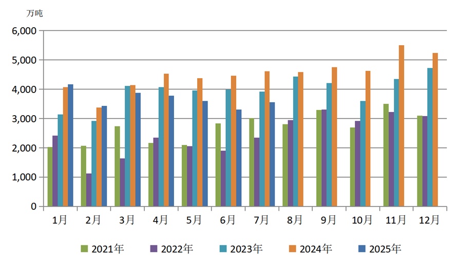 图3 2021—2025年煤炭月度进口量