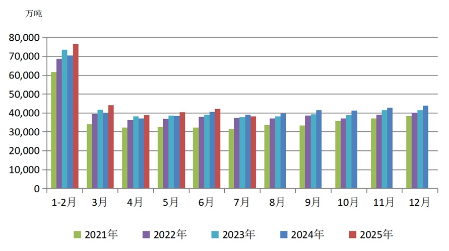 ◆ 7月煤炭主产地降雨量较往年大幅增加,煤矿生产、运输均明显受限。同时,7月国家能源局发布核查超产文件,各地方部门陆续开始执行,部分煤矿开始试行“276工作日”制度,部分超产矿井自发减量,部分煤矿停产整顿。各因素叠加之下,煤炭供应进一步收缩。当月全国规模以上工业原煤产量3.8亿吨,创下了2024年5月(包含)以来的新低,同比下降3.8%,环比下降9.52%。1—7月,全国规模以上工业原煤累计产量27.8亿吨,同比增长3.8%。