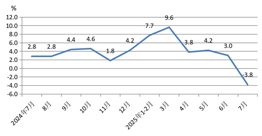 7月数据显示内需继续回落。以旧换新拉动减弱,餐饮增速也处于低位,社零增长进一步放缓。7月,社零总额同比增长3.7%,增速较6月放缓1.1个百分点。以旧换新6项零售额合计增速从11.5%降到5%,拖累社零增速放缓大约0.8个百分点。固定资产投资主要受建筑安装工程和其他费用拖累,设备工器具投资仍然保持较高增速。1—7月固定资产投资累计同比1.6%,较1—6月回落1.2个百分点。而受天气因素扰动,7月基建同比超预期负增长,7月单月基建投资同比跌幅为2.0%。房地产销售数据持续走弱,房地产投资同比跌幅扩大至下降17%,累计同比从1—6月的-11.2%下滑至-12.0%。生产端数据同比增速也有所回落,但整体好于需求端数据。7月工业增加值、服务业生产指数分别同比增长5.7%、5.8%,较6月分别下降1.1个百分点、0.2个百分点。工业生产延续平稳较快增长态势,全国规模以上工业增加值分别同比增长5.7%。国家统计局指出,7月份宏观政策发力显效,国民经济克服外部环境复杂多变和国内极端天气等不利影响,保持稳中有进发展态势,展现出较强韧性和活力。但也要看到,外部环境复杂严峻,经济运行依然面临不少风险挑战。